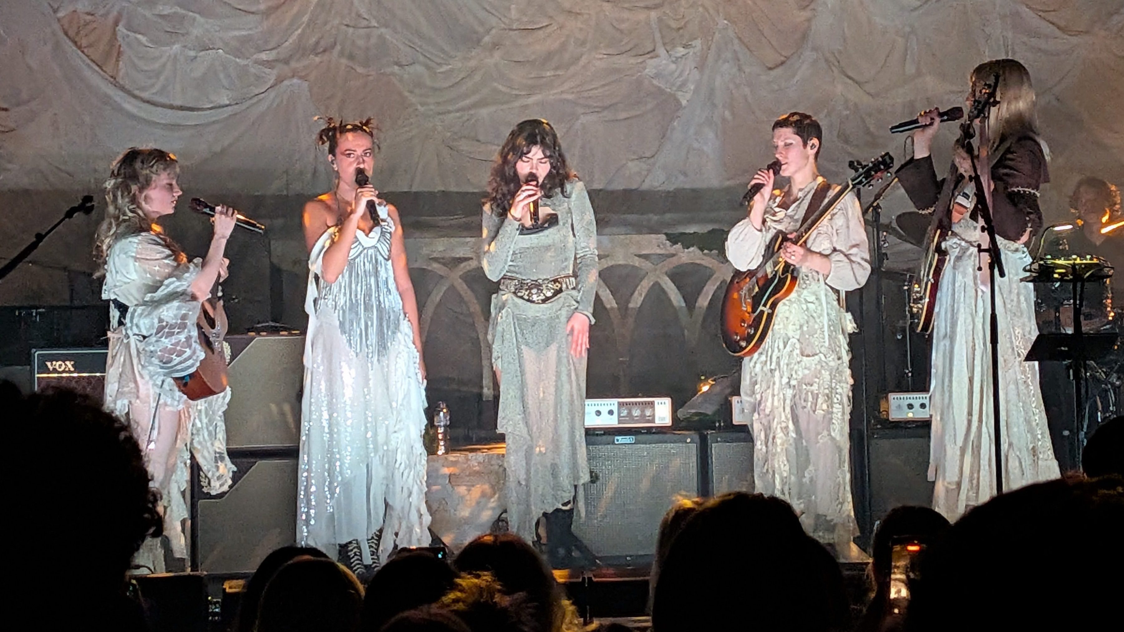 Sometimes you watch a band and its difficult to believe that they made their live debut less than four years ago. Having emerged to a music scene finding its feet in the post-pandemic era at the end of 2021, The Last Dinner Party have gone from strength to strength in that time, rapidly building up a devoted fan base as they rose up festival bills, winning Best New Artist at the 2025 Brit Awards and establishing themselves as one of the big draws on the live music circuit. Whilst it took me till early 2024 to catch theme live (read my review of their Hebden Bridge Trade’s Club show here) their infectious performances meant that eighteen months later their visit to Sheffield’s Octagon to promote recently released second album The Pyre had somehow become my sixth time seeing them live.